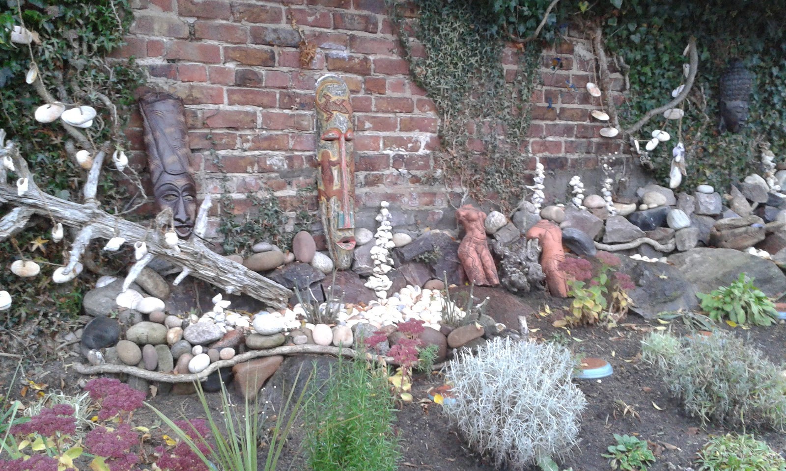 Very interesting garden at the rear of a large house which has been made into apartments. Lots of unusual features – tribal masks, shells, stones, headless bodies, and some plants.