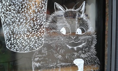 4. This is the window of a cafe in London called Antipode (can you guess why I like this place?). The window has a coffee cup (that’s the large thing in the top left of the photo) and a cat drinking coffee – apart from that there are no signs to identify the cafe. The pictures are enough to express their individuality as an independent cafe that serves excellent coffee.