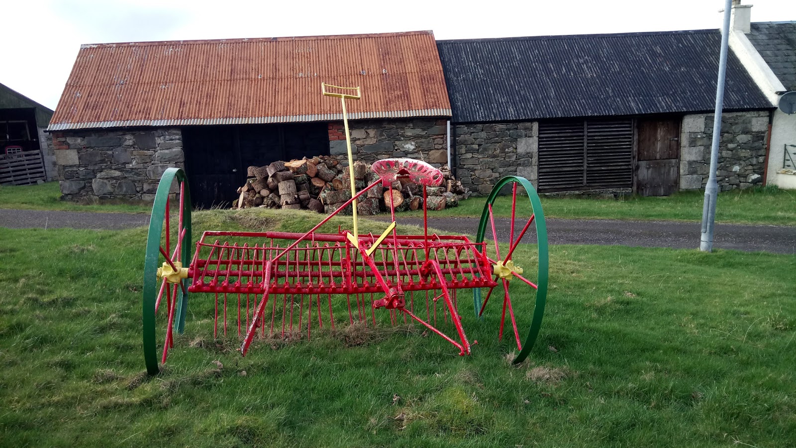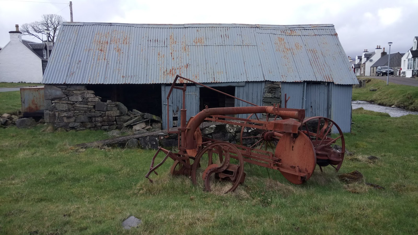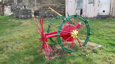 As you walk from one end of the village to the other (it doesn’t take very long) you see evidence of crofting with these beautifully restored and painted pieces of farm equipment.