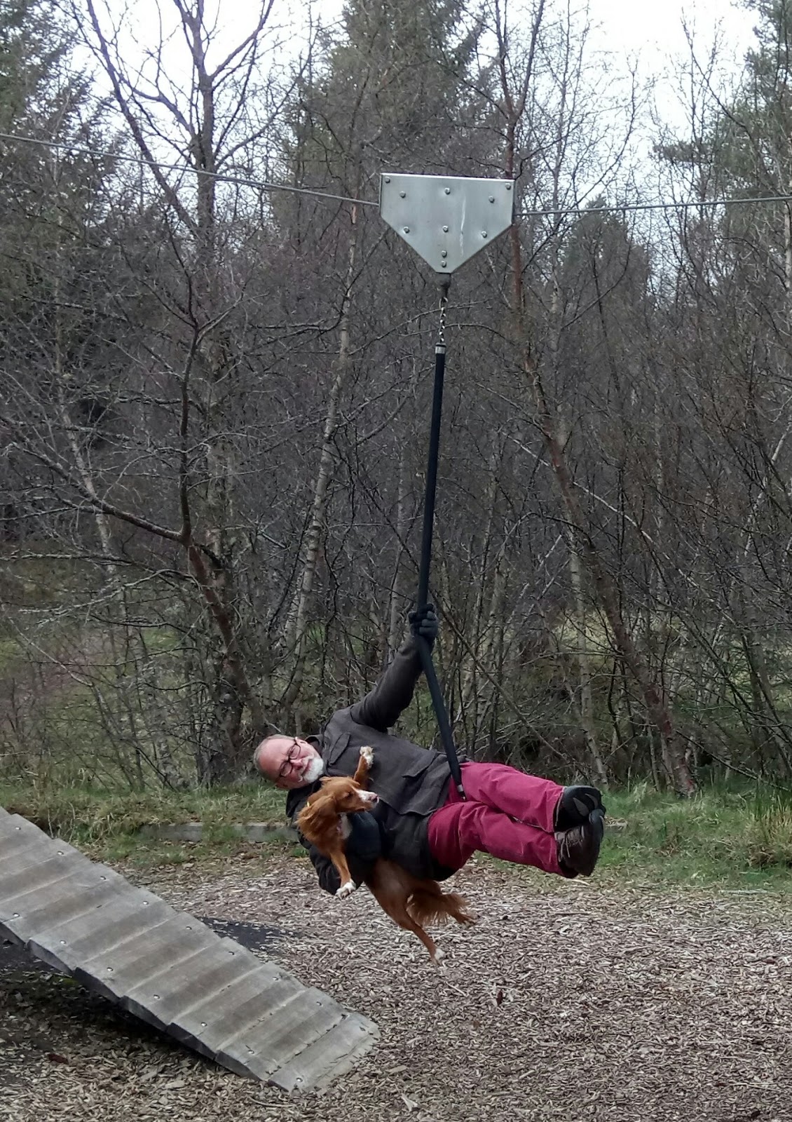As we walked through the forest we came across an adventure playground which is always a bit too tempting to the two big kids that we are. Now I semi restrained myself due to a little bit of an incident last year where I had a spectacular fall off the children’s assault course in Nairn, but Ken couldn’t resist the zip wire and decided that Bramble would want to do it with him.