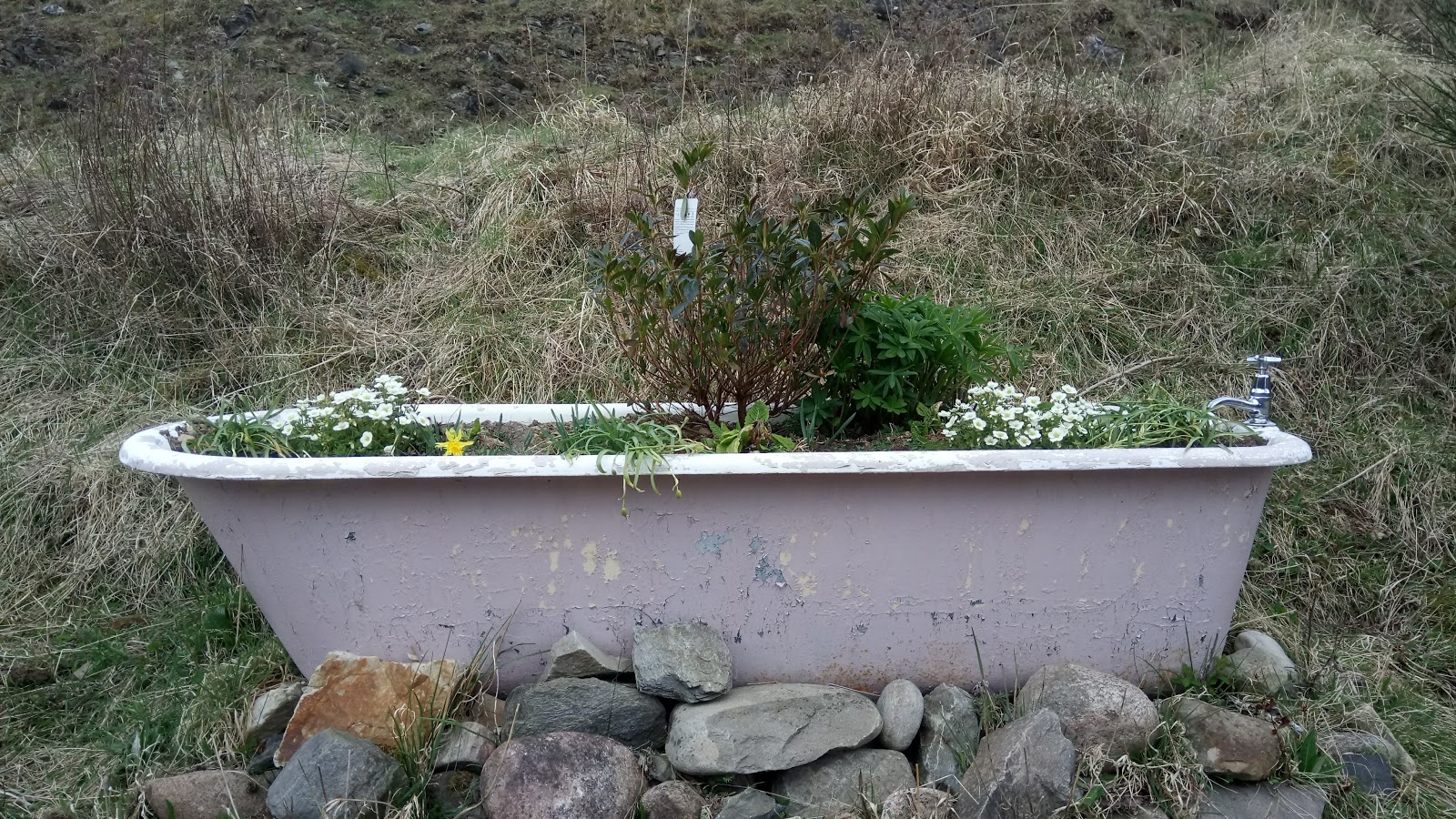 Last two photos are of the entrance to the Urlarmore farm bed and breakfast – I love how they’ve used an old knife sharpening wheel for their sign, and decorated the area with a beautiful bathtub garden.