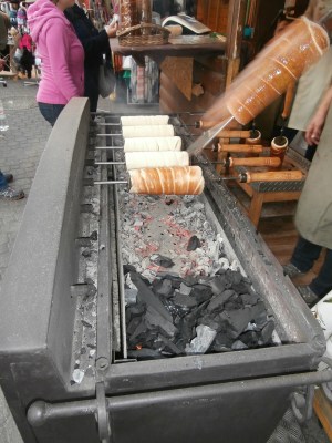 One of the unusual foods that we discovered were chimney cakes, or Kürtoskalács. They are cooked on a spit over coals and then covered with a sweet sugar mix or nuts and they are scrummy.