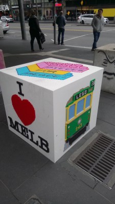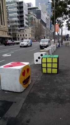 Around a lot of the CBD in Melbourne there are anti-terrorism blocks to stop attacks by vehicles. Have they been left as boring grey blocks – NO!! These blocks have brought out the very different artistic talents of the people of this fabulous city. Here’s a selection of the blocks and the art on them.