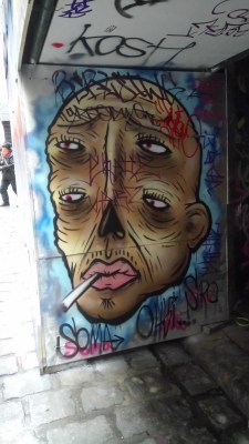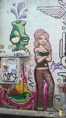 Two of the laneways that we explored were Hosier Lane and Union Lane – both still have the cobbles under foot and every bit of space is covered with paint – in some places there are many layers of art and you have to step back to appreciate what was there and what is there now. Here’s a selection of the art that stood out for me.