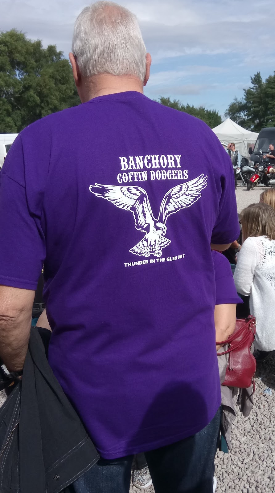 The fashion styles being sported were predominantly themed black with lots of leather. We did watch one couple get out of a car dressed in their full leathers as if they’d ridden bikes to the rally – very odd. There were also lots of dogs sporting the latest in biker doggy fashion including a leather jacket on a small dog. This gentleman was with three other people of the more mature variety and I thought their t-shirts were fittingly funny – it says Banchory Coffin Dodgers.