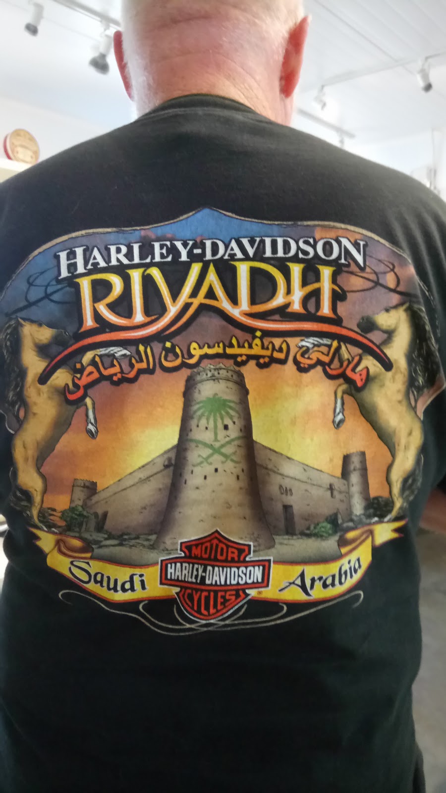 This weekend was the yearly meeting of thousands of Harley Davidson lovers at the 21st Thunder in the Glens in Aviemore – we attended last year as well and you can read about it here: Thunder in the Glens 2016. The day before we went to the actual rally we saw this man in a cafe we were visiting (just for a change) and I asked him if I could take a photo. He’s never been to Saudi, a friend bought it for him – it was giving me and Ken cold shivers as we have both worked there in the past.