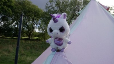 Someone (Tamara at Part-time Working Hockey Mom) commented on my facebook post that our tent looked like a unicorn tent, so what do I do, go out and adopt a unicorn for the tent. Importantly it’s a purple horned unicorn.