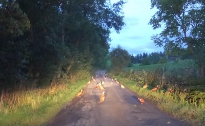On our way home we came across a very Scottish road block – pheasants everywhere. The campsite bordered a huge Scottish estate where they breed pheasants for shooting (murdering) with the season starting on October 1st. It was lovely lying in bed listening to them talk to each other at night.