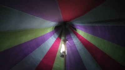 Inside the tent was a low table, a bed, and lots of lamps and candles. There was also a kettle if you wanted to put it on the woodburner. This is looking up at the top of the tent from the bed.