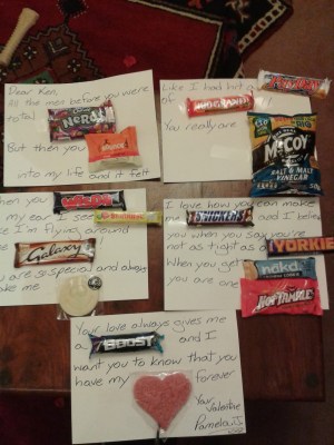 8. I absolutely adore all the romance ideas that can be found within Pinterest and this is one I did a few years ago for my beloved – a letter with words replaced by sweets, chocolates, or crisps.