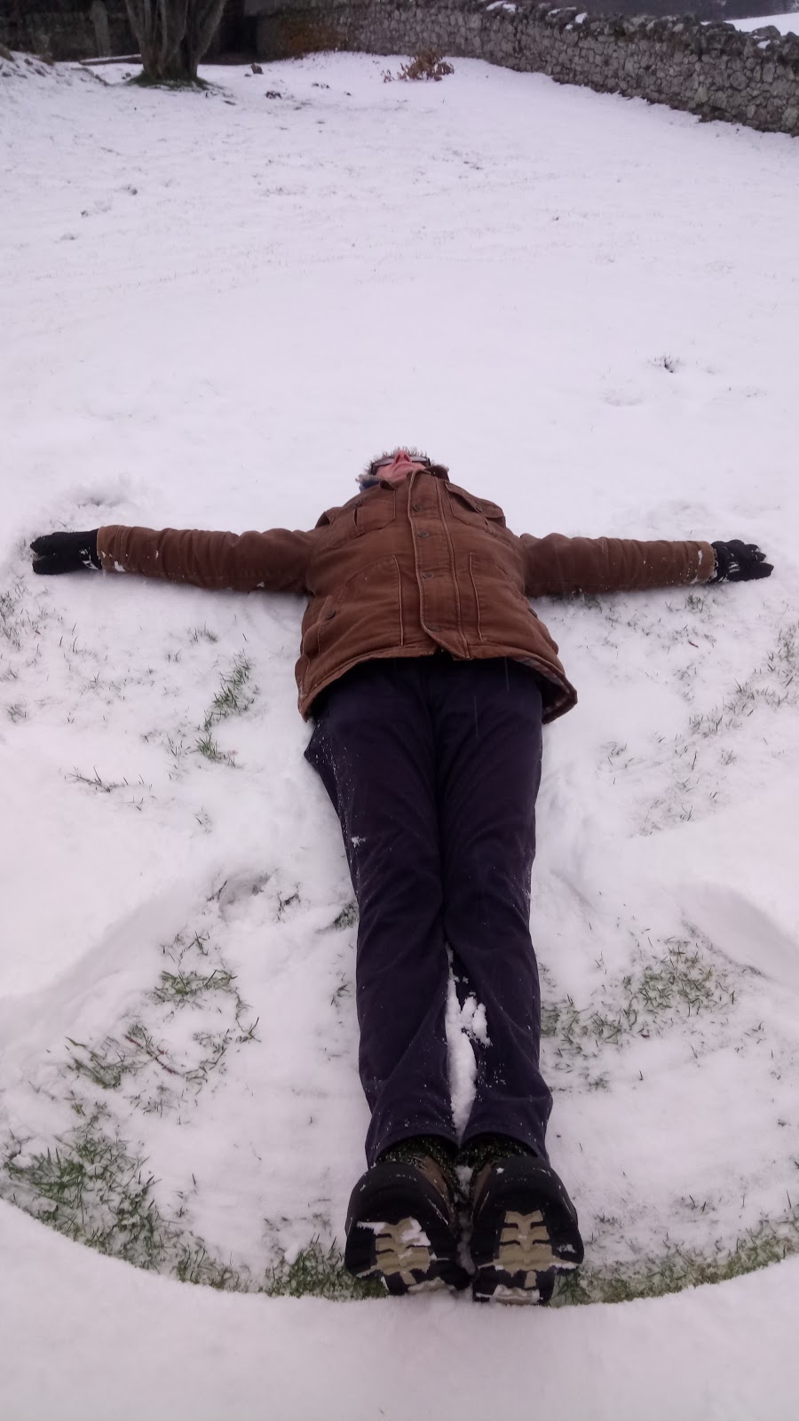 Something I’d never done in my life was make a snow angel, so what better place to do it than in a medieval graveyard. Ken went first and I think he makes a spectacular angel whereas I’m hidden by my angelic assets. I was very excited at making my first ever snow angel.