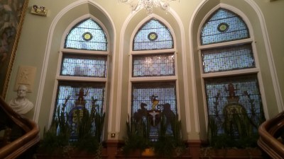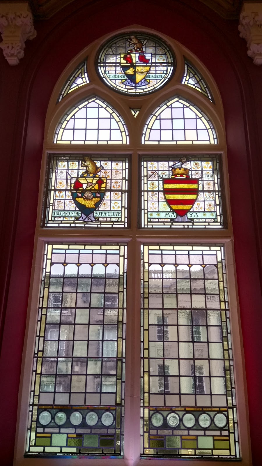 The windows that line the hall have clan coats of arms on them and this one really drew our attention.