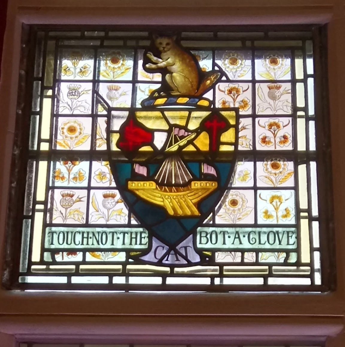 The motto is; Touch Not The Cat Bot (but) A Glove! When I asked Mr Google what this was all about, it seems it is the motto of Clan Macpherson and implies that the clan has claws and you must be careful how you approach them.