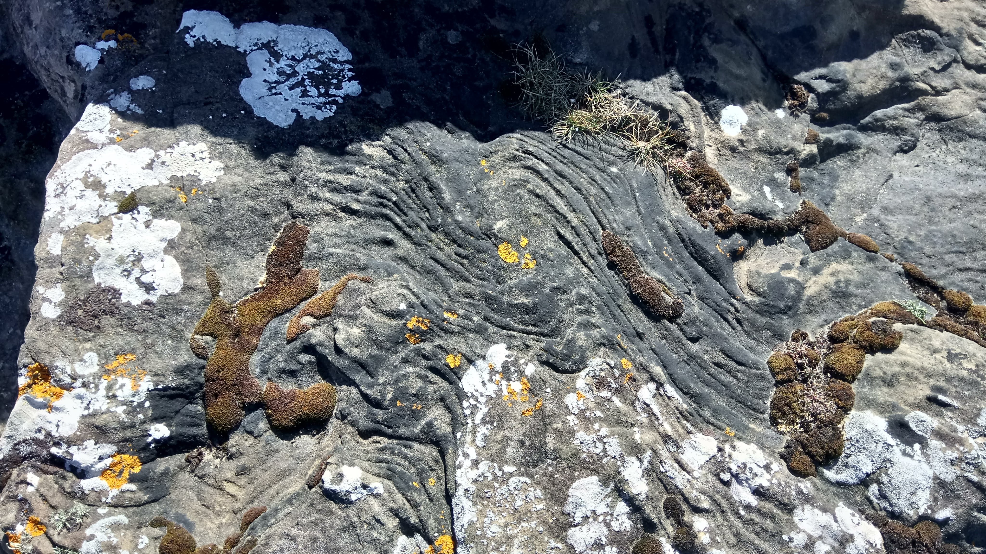 This rock shows the pattern of cooled lava that existed thousands of years ago – you can see the wave pattern in the rock.
