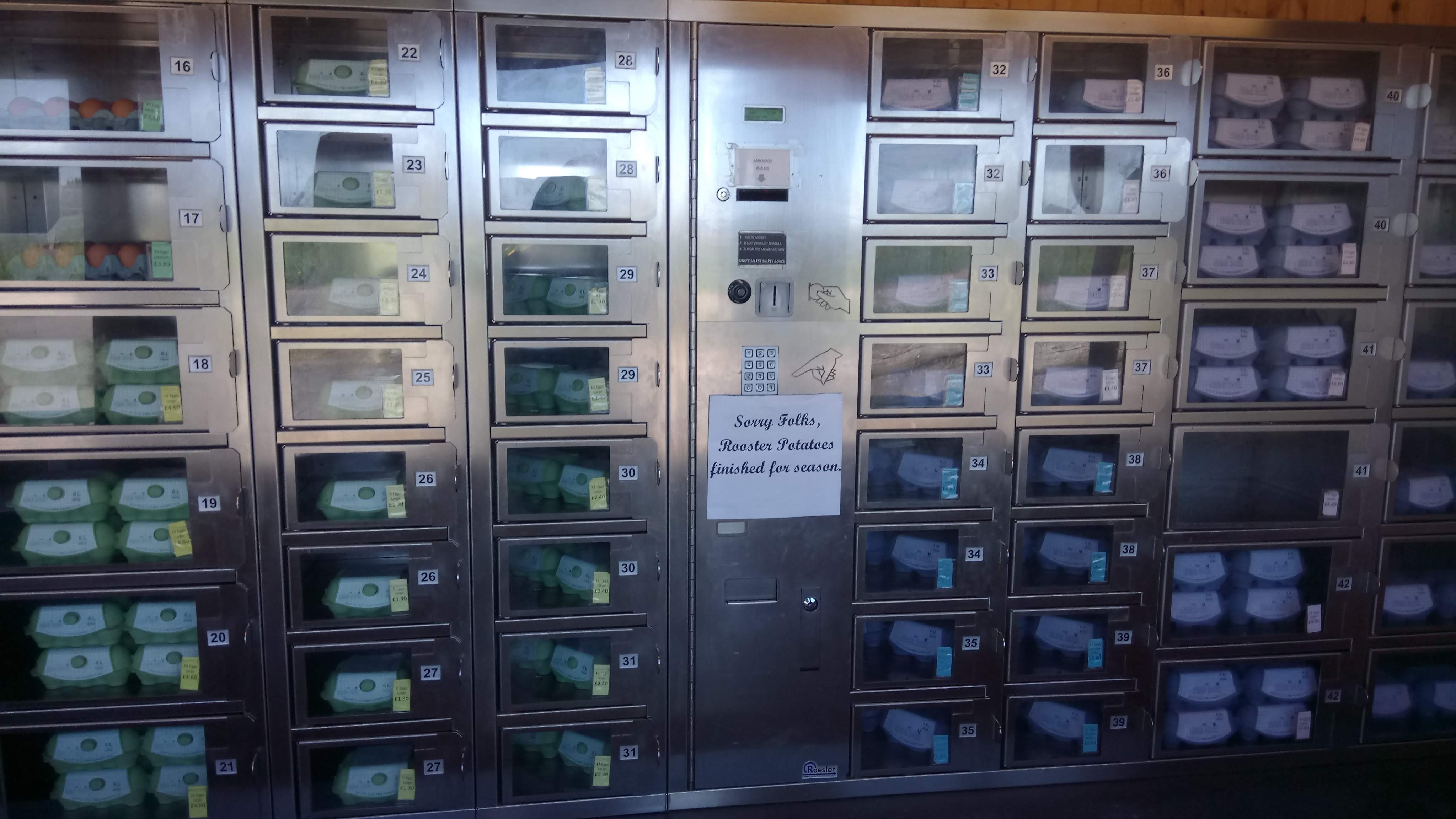 Inside the shed the eggs are in a large vending machine – you put your money in, choose a number, and then that section opens for you. They had all different sizes and they even had double yolkers for sale. We of course had to buy some of these eggs, knowing that they would taste fabulous because of the life the hens have.