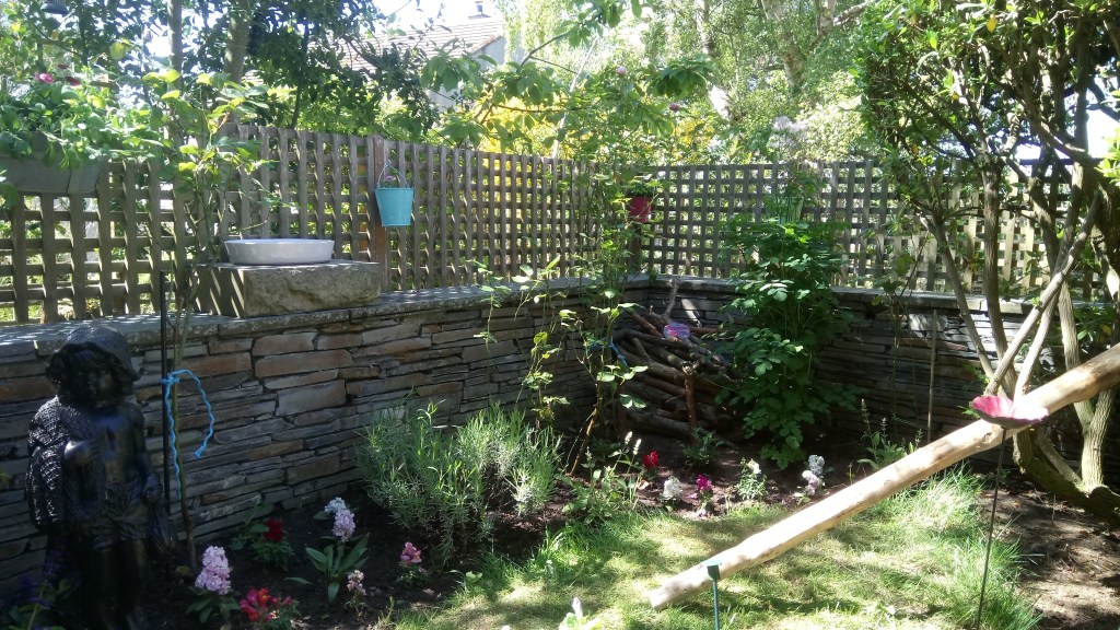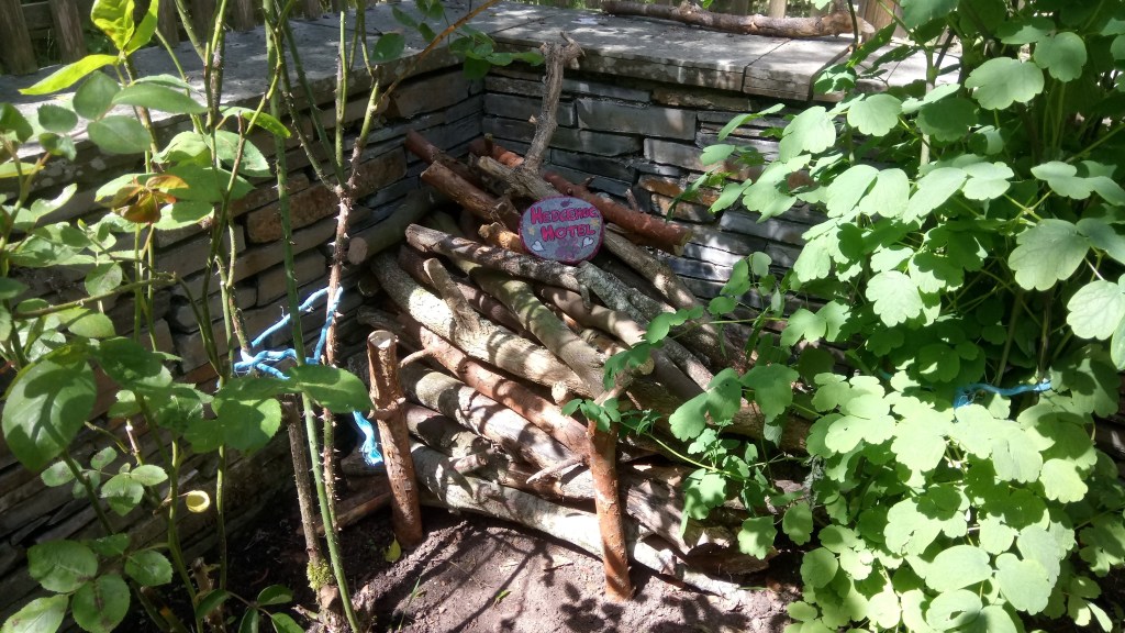 We love watching natures creatures enjoy the garden, so Ken has created a hedgehog hotel and I’ve made a sign for it so they can spot it easily. This is the view of the hotel from the side – the logs are actually covering a box which is full of hay to make a lovely comfortable bed.