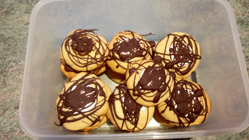 I have managed to do some baking, and this week it’s thumbprint cookies filled with marshmallow fluff and covered with chocolate. Ken had been wanting me to bake something involving chocolate, so hopefully this will satisfy his craving for a while.