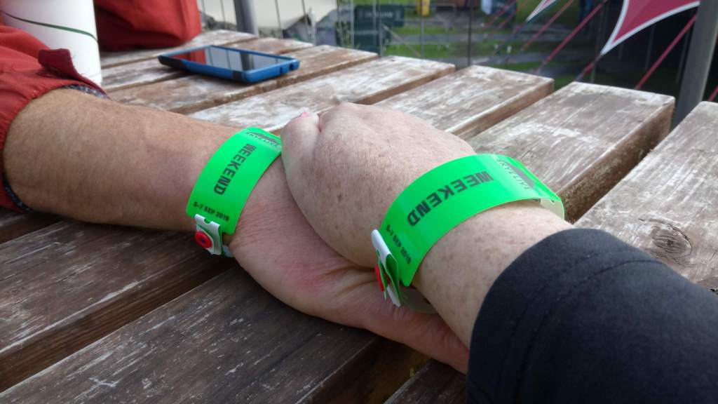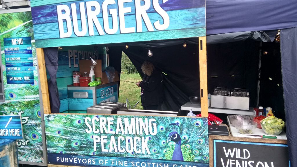 Here’s a few shots from around the festival – interesting name for the burger van, the screaming peacock. The green wristbands are our entry tickets for the whole weekend, and the area with the castle turret is where the dj’s performed at night for people to dance and mingle.