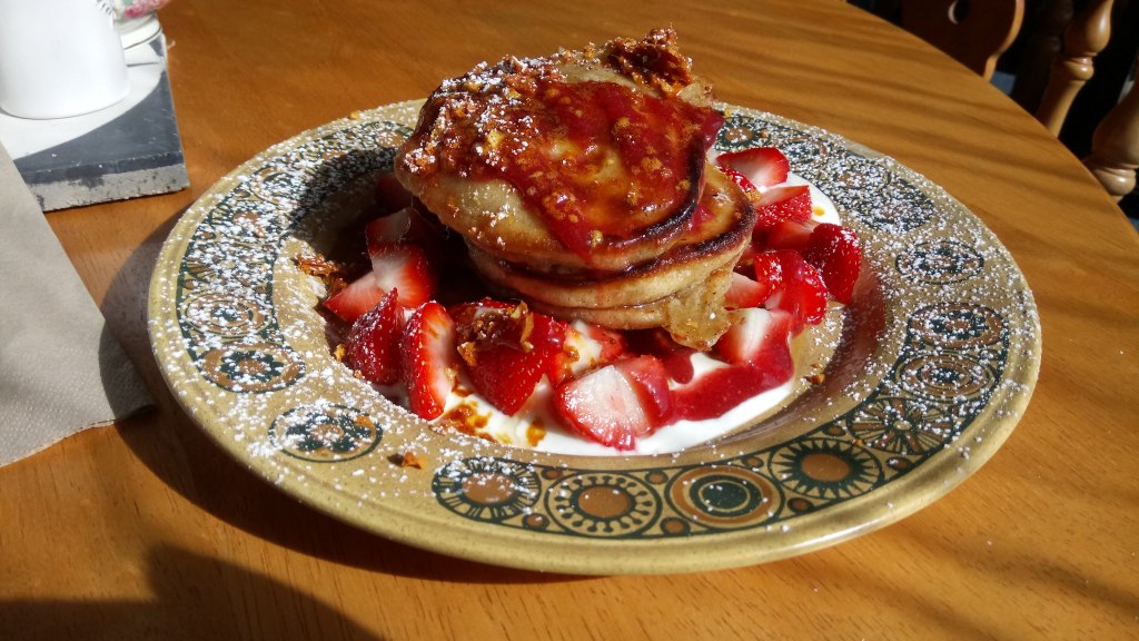 The breakfast was phenomenal – it was a pancake stack, described on the menu as “a pile of wee Scottish pancakes” with Greek yogurt and fruit. Pictured alongside my breakfast are a couple of quotes that were hanging up and a book with a great title.
