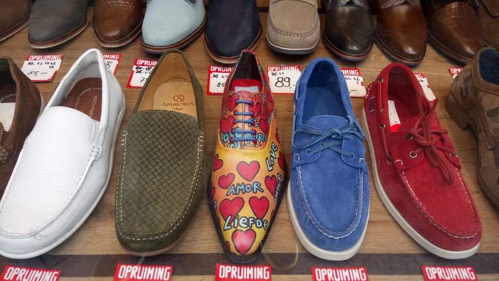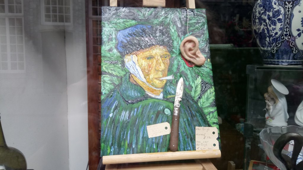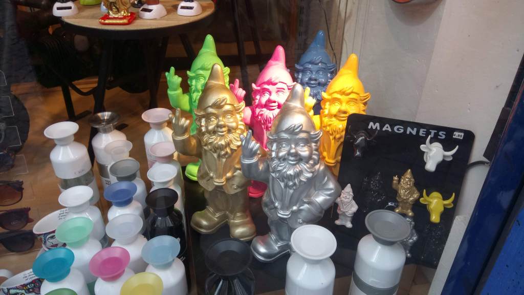 We also love the things you see in shop windows including this interesting painting of Van Gogh, some disrespectful garden gnomes, and fabulous love shoes which I think would look great on Ken (for some reason he didn’t agree with me).